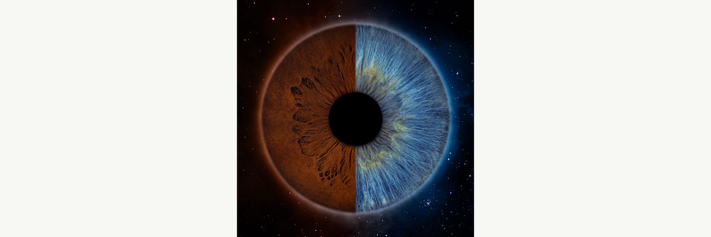 I was especially enthusiastic about iris photography. I’m so in love with Troy’s eyes, and the idea of having our irises photographed and combined into a half-and-half image felt so intimate and exciting. Troy showed me a keychain of half and half eyes which is how we found out about this place, but I couldn’t find many details about options and the process, so I went into the experience pretty blind—but super eager.