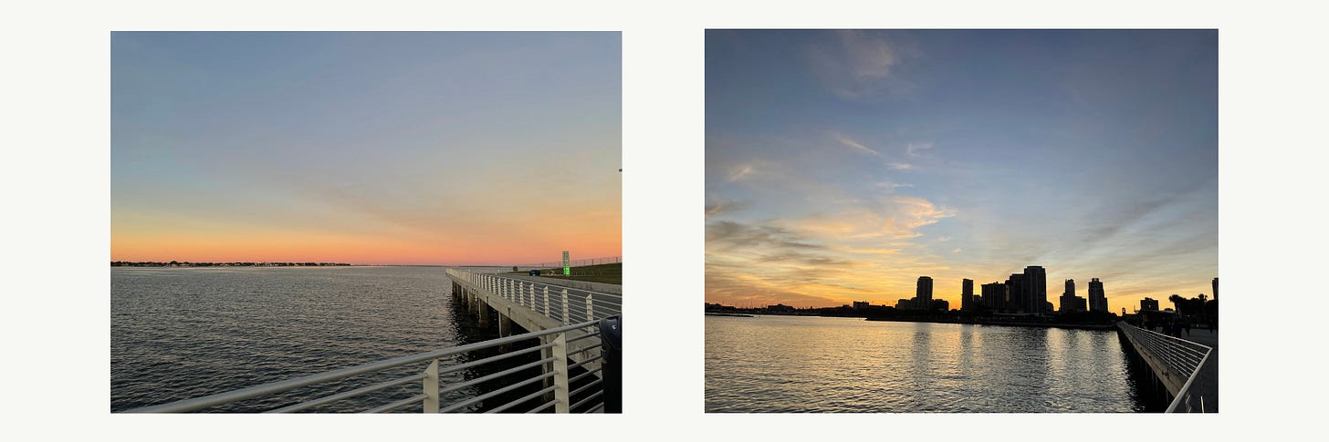 When we arrived, we took a short walk along the St. Pete Pier. I love piers in general—the stretch into the water, the sense of being surrounded by the sea—so I never pass up the chance. We wandered until the chill started to sink in a bit too much and then headed back to the car, ready to warm up and head to the studio.